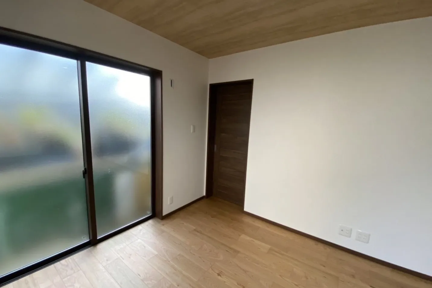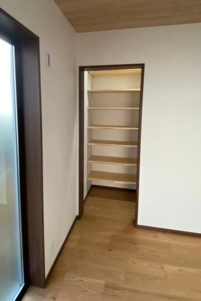 壁面にはドア付きの収納スペースを設け、生活用品をすっきりと片づけられるようにしました。