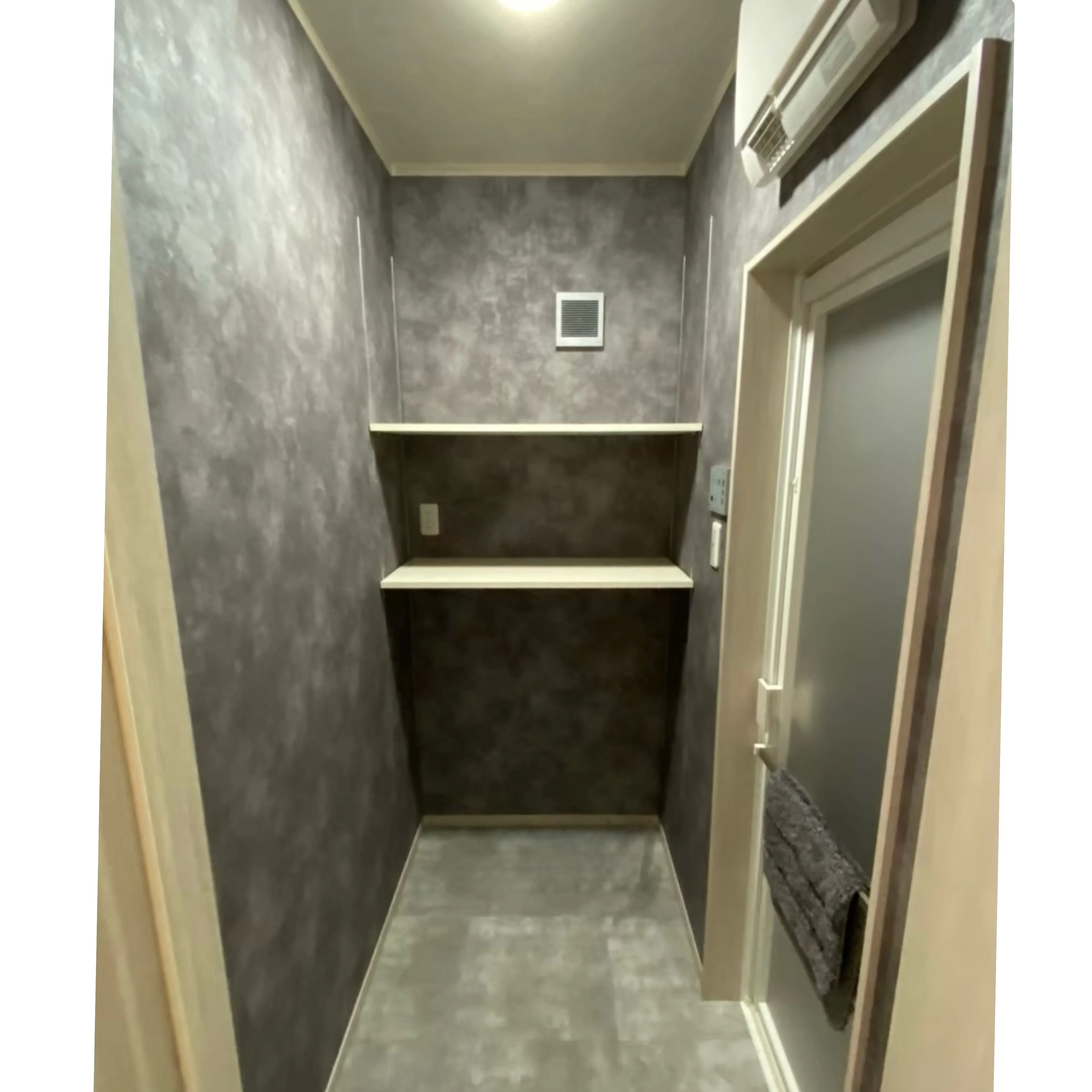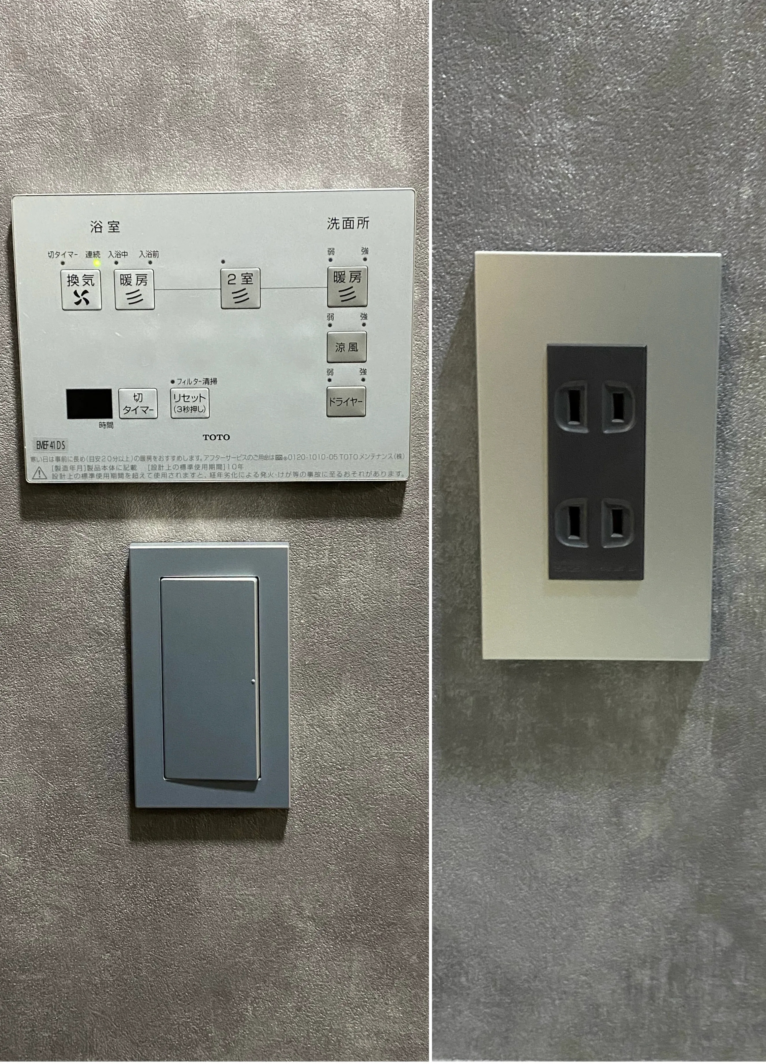 浴室・脱衣室・トイレはグレー基調でコーディネート。コンセントやスイッチの色にもこだわり、落ち着いた統一感のある仕上がりに。廊下のクロスは雰囲気を切り替え、空間全体にメリハリをもたせています。