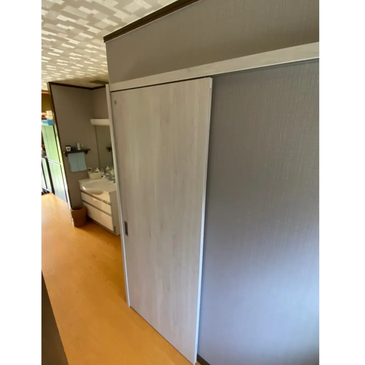 新しく入れ替えるとともに、これまで脱衣室とトイレの開き戸がぶつかっていた出入口を改善。正面の開き戸から側面の広い面を使った引き戸へ変更し、動線がスムーズになりました。