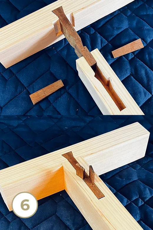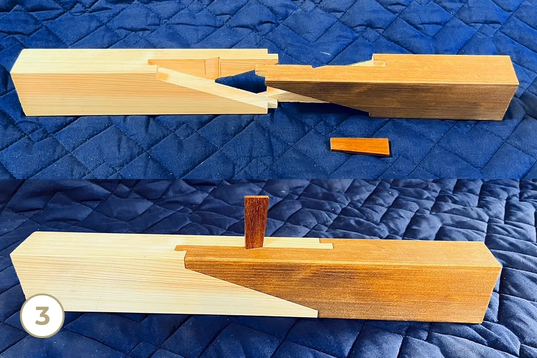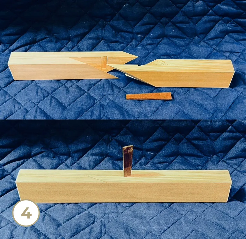 写真6:引独鈷(ひきどっこ)(車知栓打ち しゃちせんうち)…お寺の破風板と母屋の接続に使われたりする。